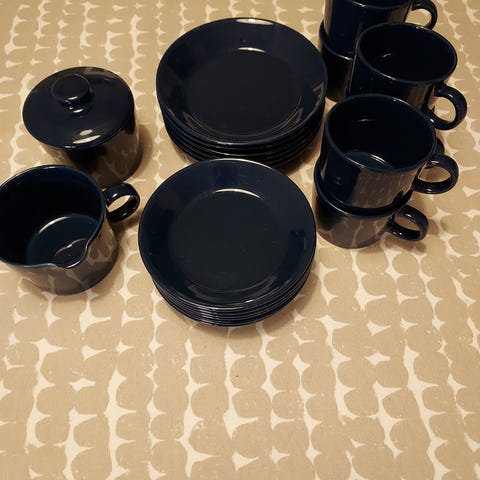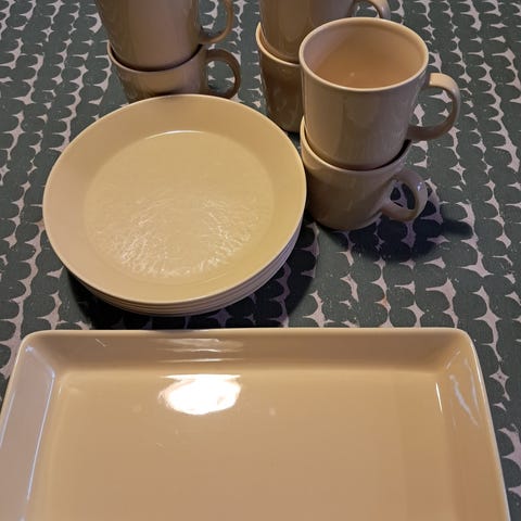 Arabia Teema astiasto sisältää valkoisia posliinisia kuppeja ja lautasia. Sarja on suunniteltu monipuoliseen käyttöön keittiössä.