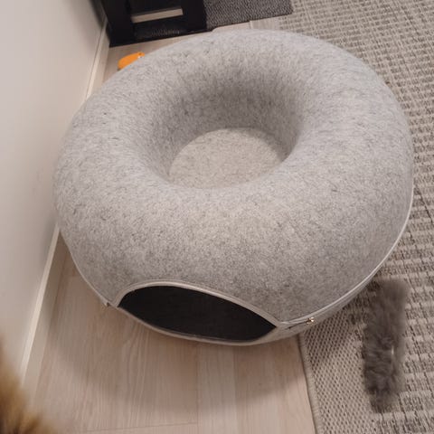 Käyttämätön tosi pehmeä ja muhkea donitsipeti kissalle tai pienelle koiralle. Väri harmaan kirjava, halkaisija 65 cm. Nouto mielellään Hirvaskankaalta tai jos itselläni on kulkua Jyväskylän suuntaan niin kulkeutuu mukanani esim. Palokkaan.