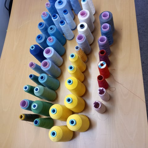 Kaksi marjapuuron väristä ompelulankaa saumuriin