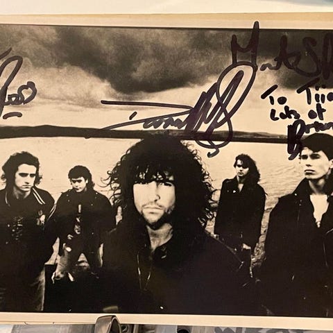 Dare -yhtyeen nimikirjoitukset lehtileikkeessä. Mukana mm. bändin perustanut ja Thin Lizzystä tuttu Darren Wharton.