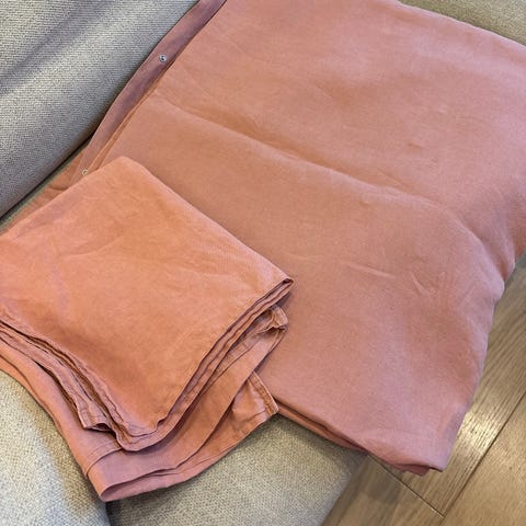 Myydään uusi pussilakanasetti, vain käyttöönottopesty. Tuplaleveän peiton pussilakana ja kaksi tyynyliinaa. Materiaali 100 % pellavaa, väri haalea vaaleanpunainen/roosa. Valmistaja Aina.