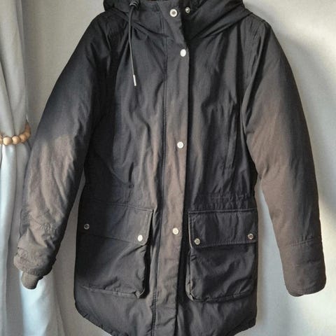 Lämmin, puolipitkä naisten Elvine talvitakki, koko M (reilua kokoa mielestäni). Takki on tummansininen.
