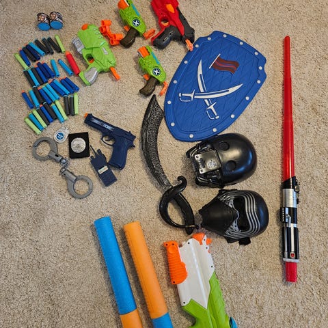 Kasa leluja, Nerf pyssyjä ja panoksia, valomiekkoja ja kauko-ohjattavia leluja. Hyvässä kunnossa ja kaikki toimii kun pattereita vaihtaa. Nouto Karakalliosta