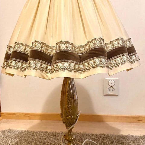 Messinkinen vanha upea pöytävalaisin. Kokonaiskorkeus 66,5 cm. Johdotukset uusittu. Varjostinta ei ole.
