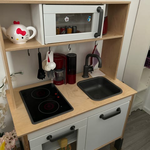 Ruokailuvälineitä, lstenrattaat ja uuni.