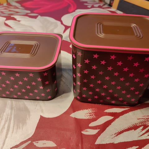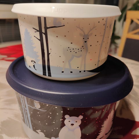 Vähän käytetyt Tupperwaren jouluiset One touch säilytysastiat, 940 ml ja 2 l. Yhteensä 14 €.