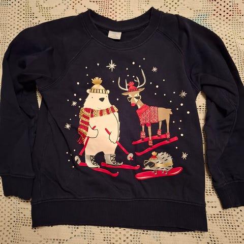 Ihana kuvio, jossa hieman kulumaa. Muuten hyvökuntoinen paita. Hihassa joku rasvatahra, joten pesen vielä.