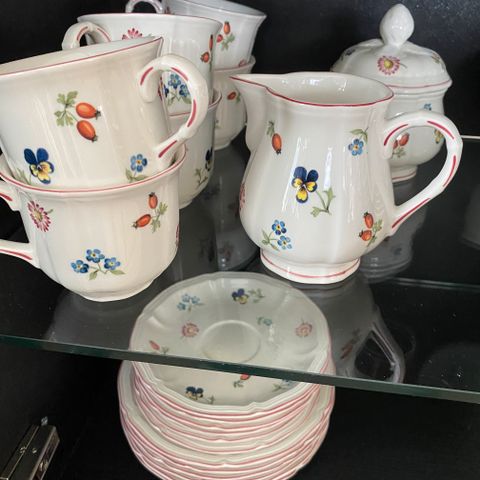 Villeroyn klassikoksi muodostunut (edelleen myynnissä oleva) Petite Fleur kahvikuppisetti, 6kpl kuppeja ja 6kpl tasseja. 15€ per setti.