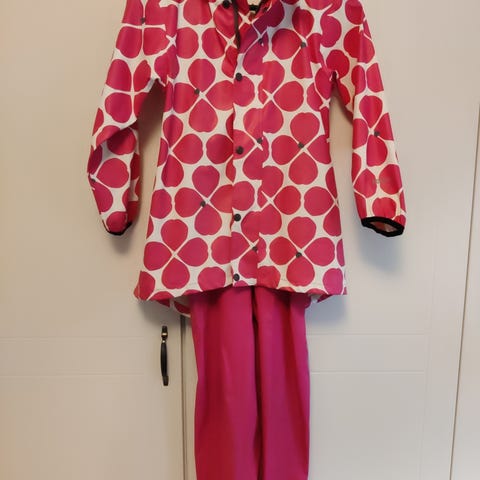 Yhden lapsen käyttämät sadehousut sekä sadetakki. Housut kokoa 122, takki 128. Takkia pidetty vähemmän.