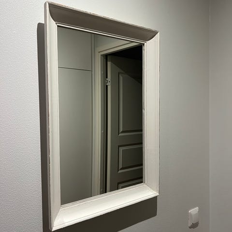 Upea tiikkipeili. Kauniit messinki yksityiskohdat kulmissa. Ajan patinaa, ei kuitenkaan mitään huomattavaa. Peili on hiottu reunoilta. Korkeus 94,5cm ja leveys 38cm. Kehykset ovat hieman leveämmät keskeltä 39.5cm.