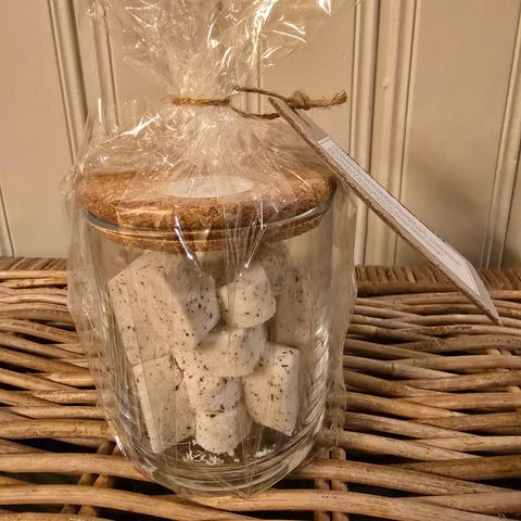 5kpl vaniljantuoksuisia kylpypommeja lasipurkissa. Muodot oravat ja tammenterhot.