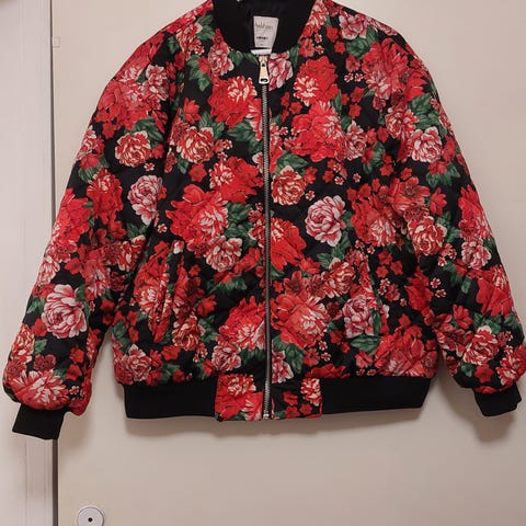 Hieno värikäs bomber-tyyppinen takki kasvikuvituksella. KappAhl koko XL. Kuin uusi, en löydä vikoja!