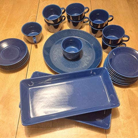 Arabian Kilta-sarjaa, kaksi kuppiparia, sokerikko ja kermakko. Vetoisuus 2 dl. Väri tumman vihreä, vaaleat kohdat heijastuksia. Siistit ja hyväkuntoiset, lautasissa pintakulumaa. Leimat kuluneet sokerikkoa lukuunottamatta. Yhteishinta 30 €.