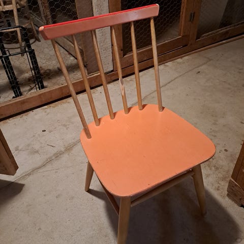 Suoraan 1970-luvulta. Yksittäinen puutuoli. Sorvatut jalat ja selkänojan pinnat.