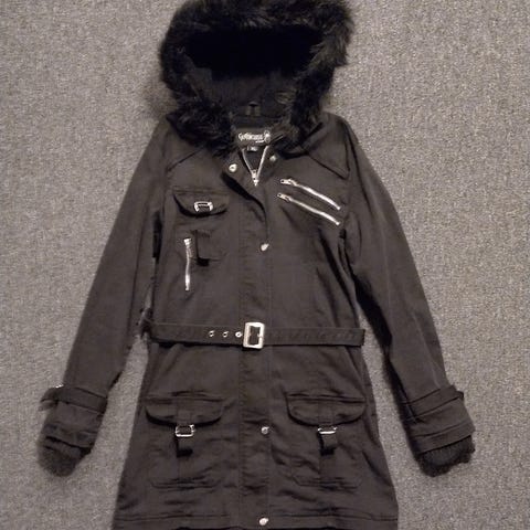 Gothicana pitkä takki naisten koko L. Väriltään se on puna/musta ja ruudullinen. Se on nilkkapituinen noin 160cm ihmisellä. Kauniiksi kehuttu (itselleni pieneksi jäänyt kuten kuvasta näkyy). Se ei sovellu koviin pakkasiin, vaan leudoille ilmoille. Paljon pidetty, ei ole ollut tyhjänpanttina. Ei vesipesua (kangas ei haise, tuulettaa voi haluttaessa, se riittää). Silitys alhaisimmalla lämpötilalla, jos tarvis. 30% villaa, 70% polyesteriä.
