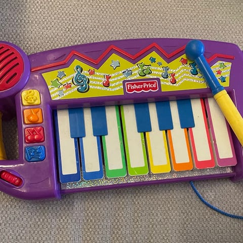Fisher-Price lasten leikkipiano, jossa on värilliset koskettimet ja erilaisia musiikkitoimintoja.