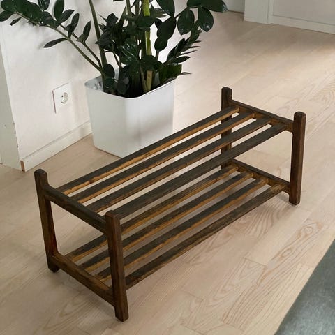 Hyväkuntoinen Yamazaki Tower kenkähylly. Puisessa pinnassa mukitahra, jota yritetty saada pois. Muutoin hyvässä kunnossa.