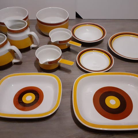 Myydään kuvan astiat. Nätit -70 luvun väreissä olevaa Rörstrand Focus sarjaa. Toivotaan noutoa, ettei mene rikki.