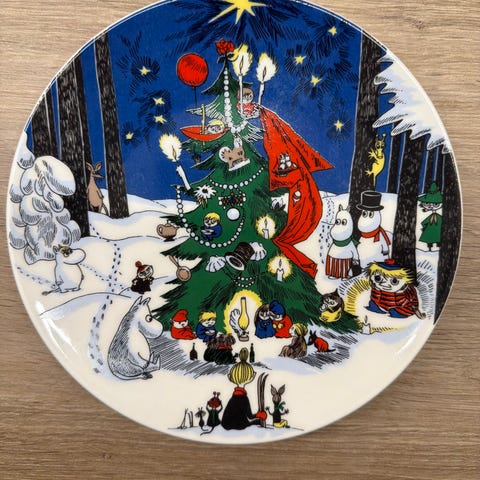 Arabia Muumi koristeellinen lautanen, jossa sininen tausta ja Muumi-hahmot. Lautanen on valmistettu posliinista ja soveltuu koristekäyttöön.