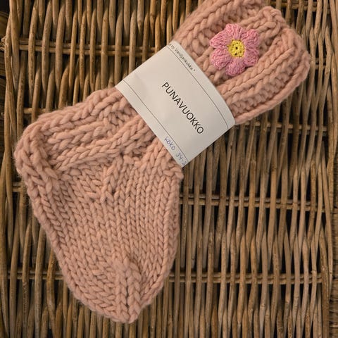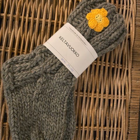 Uudet, käsin kudotut muhku kotisukat Novitan hyggelangasta. Puuvillasta virkattu punavuokko molemmissa sukissa. Koko 36.