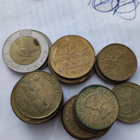 Suomen metallirahat III kansio sekä eriarvoisia markkaseteleitä ja -kolikoita. Lisäksi 2003 vuoden Jääkiekon MM-kisojen 5 euron juhlaraha. Voidaan myydä myös erikseen.