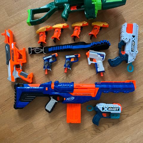 Hyväkuntoinen lelusetti pojalta myyntiin. Iso Nerf delta trooper pyssy, pienempi vastaava Xshot pyssy, moottorisaha pyörivällä "ketjulla" ja äänellä, helikopteri, sudenpentujen käsikirjoja ja uninalle kaupan päälle :)