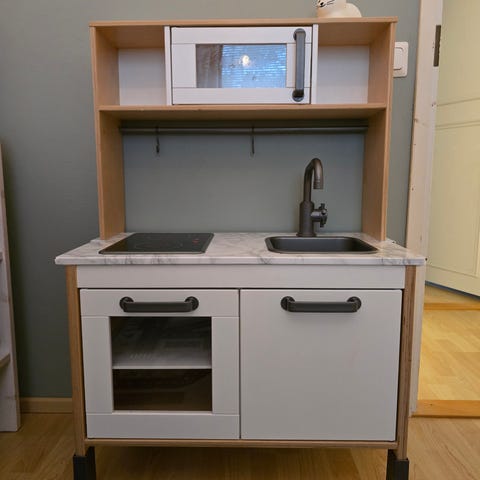 Ikeasta pari vuotta sitten uutena ostettu leikkikeittiö/ kauppaleikki. Pientä käytön jälkeä ja muutamia tarroja liimattu. Toisinpäin käännettynä kioski/kauppaleikki, jossa liitutaulu alareunassa, toisinpäin leikkikeittiö. Nouto Juankoskelta. Tulee omien menojen mukaan Kaaville.