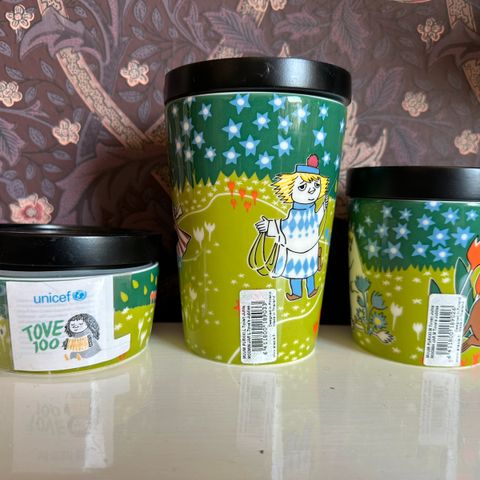 Myydään Arabian muumipurkki Ystävyys 1.2 l (korkeus 16 cm) 2 kpl, muumipurkki Stockmann 0,3 l (korkeus 9 cm) MYYTY, Toven juhla -muumipurkki 0,1 l, koko S (korkeus 5.7 cm). Uusia, käyttämättömiä, tarrallisia, erinomaisessa kunnossa. Toven juhla -purkin mattamustassa muovikannessa pientä pintanaarmua, mikä huomioitu hinnassa.