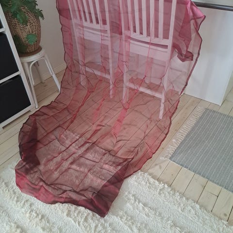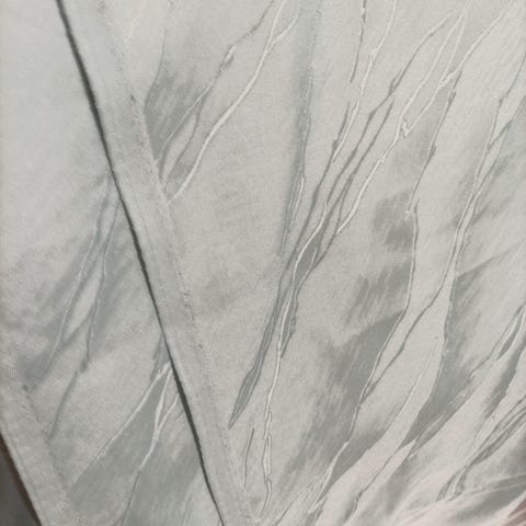 Kauniit valkoiset verhot joissa valkoisella kauniita kuvioita.