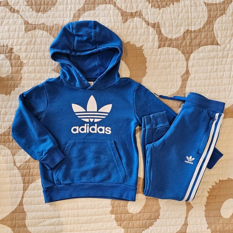 Hupparissa edessä taskun kohdalla ja toisessa hihassa pientä käytänjälkeä, tahranpoistoa ei ole kokeiltu. Muuten oikein siistikuntoinen setti.