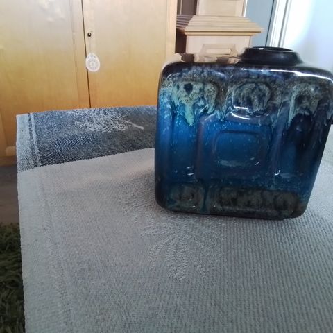 Myydään upea maljakko/pikari. Vaalea pohjasävy, ruskeita pilkkuja ja koristeraitoja laava-tyylillä, suklaanruskea sisus. Itä-saksalainen, vaaleaa savea oleva maljakko on todennäköisesti Strehla Keramik (VEB Sachsen, Steingutfabrik Strehla). Pohjan leima on kulunut, mutta muodoltaan sama. Google haku paljastaa samantyylisiä maljakoita ja Strehlan tehtaan leimat. Viimeisessä kuvassa värisävyä muokattu, jotta leima ja mallinumero erottuu paremmin.