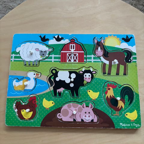 Tässä on jo vähän enemmän haastetta taaperolle, paloja paljon ja kaksi niistä kaksiosaisia. Yksi pala puuttuu, huomioitu hinnassa.