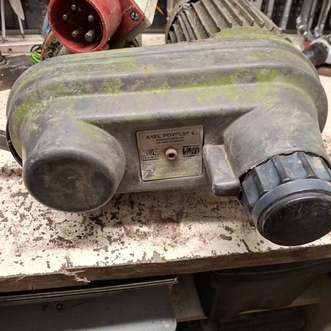 Lähes antiikkinen sähkömoottori laakerien rasvakupeilla ja lattahihnapyörällä.