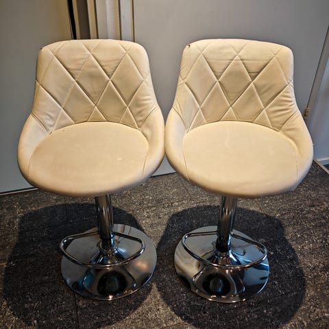 Valkoiset, nahkajäljetelmä. Toisen tuolin reunassa pieni vekki.