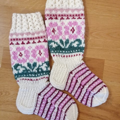 Käsin neulotut villasukat 33-34 jalkaan,harmaa ja monivärinen