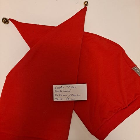 Kaksi tummemman punaista tonttulakkia, koot kuvissa. Olleet noin 1-2v ja 3-4v lapsilla käytössä pari joulua.