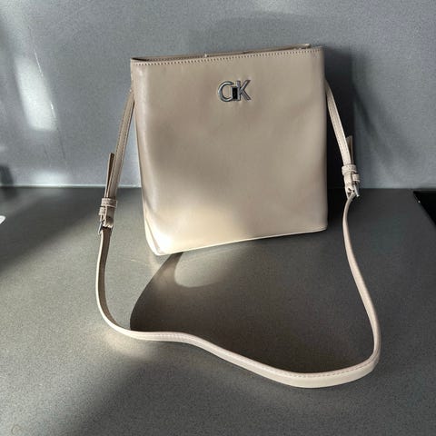 Calvin Klein naisten olkalaukku (Camera bag) valmistettu tekonahasta. Laukussa on säädettävä olkahihna, jossa Calvin Klein -logo. Laukun väri on beige. Kerran käytetty eli kunto kuin uusi.