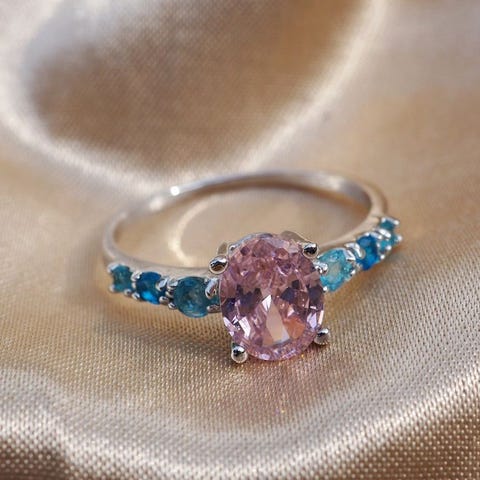 Rosa-kivinen sormus, iso rosa synteettinen topaasi halk. 12 mm, sivuilla lilat pikkusydänkivet . Sormuksen halk. 20,5 hopeoitu korumetalli,h. 18 € + pk 2,75