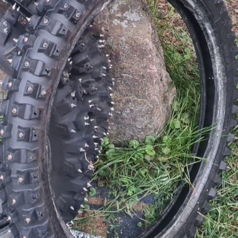 21 tuumainen Michelinin suht hyvä piikkikumi ja Dunlopin nappulakumi, johon muutama nasta laitettu