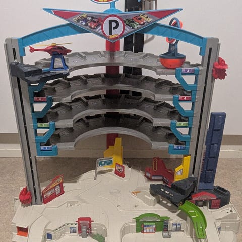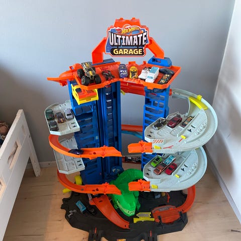 Hot Wheels Ultimate Garage parkkihalli, sekä track builder setti jossa erilaisia radan osia ja useita pieniä autoja. Autoja 50 kpl. Yhdessä luiskassa halkeama, mutta ei haittaa auton kulkua radalla. Nouto Tiituspohjasta.