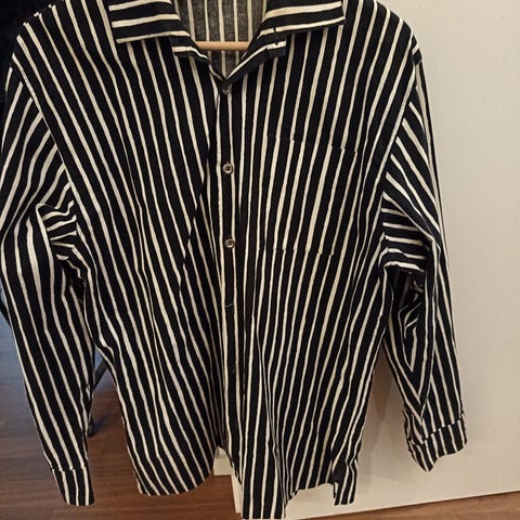 Marimekko M-kokoinen pitkähihainen paita (miesten/unisex), valmistettu 100% puuvillasta. Paidassa on oranssi-mustaraidallinen kuosi.