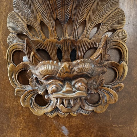 Käsinkaiverrettu balilainen Barong puunaamari puunaamio, Bali Indonesia