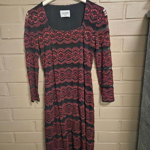 Juhlamekko Allison koko 36, hyvässä kunnossa, polvipituinen, joustava, vuorillinen, eläimetön ja savuton talous