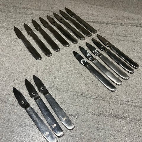 Hackman Sorsakoski metalliset rapuveitset 6 kpl. Veitsen pituus noin 15 cm. Käyttökuntoiset, naarmuja koska ovat todella vanhat. Harvoin myynnissä. Hinta 6 kpl 30 euroa +postikulut.