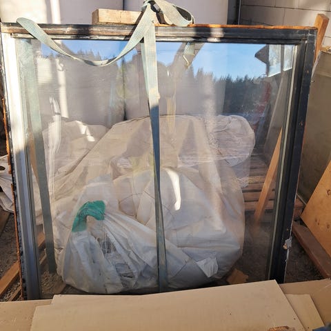 Lasitiilistä tehty kiinteä ikkuna. 48cmx48cmx12cm. Ulkopuoli valkoinen ovi- ja ikkuna maali. Sisäpuoli sävytetty Sasu Saunasuoja. Voi tietysti maalata mieleisekseen. Jäi yli kun tein kolme ja menikin vain kaksi.