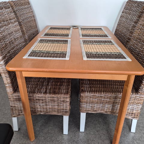 Kauniit ja tukevat rottinkituolit. Kolmessa tuolissa etuosan alareunasta rottinki vähän rispaantunut, vaihtamalla saa hyvät. Päällyset myös helposti vaihdettavissa, niissä nyt vähän tahraa joka varmaan lähtee tekstiilipesurilla pois. Nouto Peltolammilta.