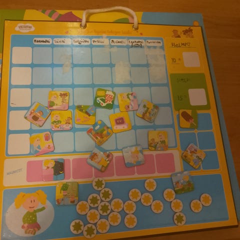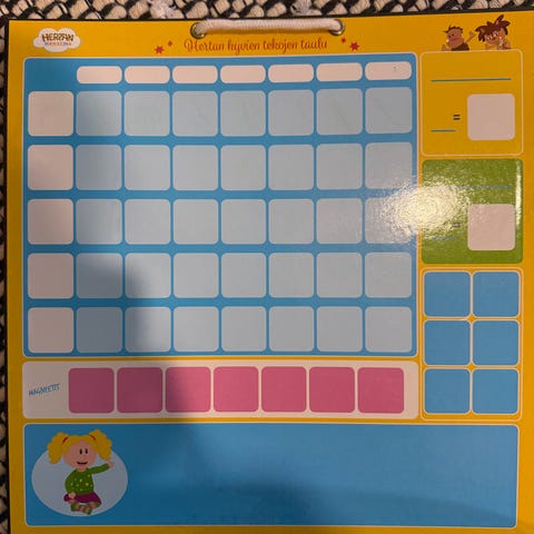 Myydään Hertan hyvien tekojen taulu/palkintotaulu. Voi ripustaa lenkillä seinään, sisältää magneettisia palkintokuvia 9 kpl ja tehtäväkuvia 11 kpl, sekä tähtimagneetteja suorituksista 35 kpl vihreitä, 34 kpl keltaisia. Yksi siis puuttunee. Tarttuvat tauluun.