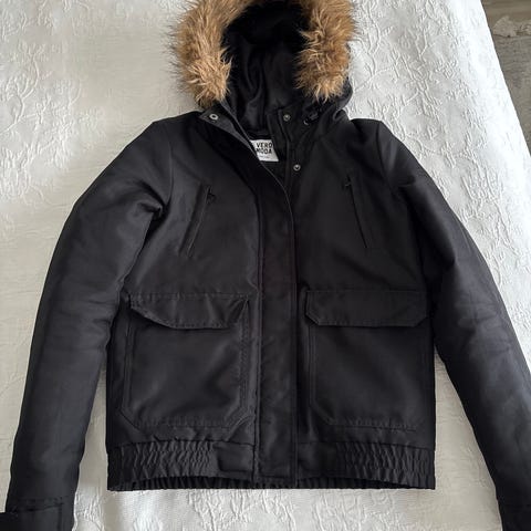 Kiva B Young merkkinen takki, koko S, käytetty pari kertaa, mahdollinen pesu jää ostajalle. Vyö mukana. Turkkiskaulus irrotettava