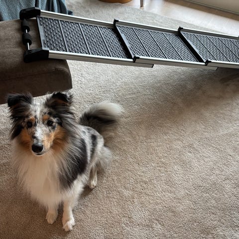 Myydään kuvan mukainen Lidlistä ostettu koiran ramppi. Lisätty liukuesteteippiä estämään koiran tassujen liusuminen. Muutaman kerran käytetty. Toinen lukitusvipu uupuu .