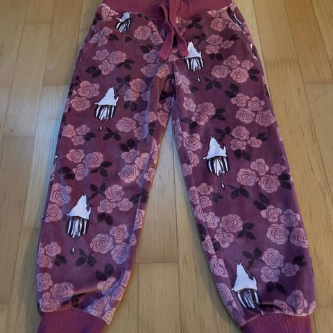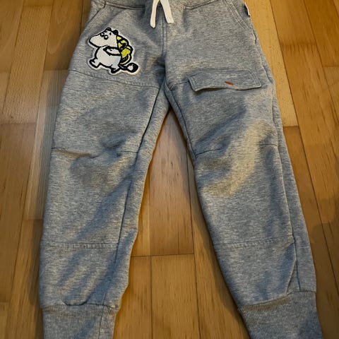 Myydään lasten uudet Muumi-housut, koko 110cm. Molemmissa sivuissa Moomin -teksti.